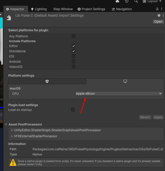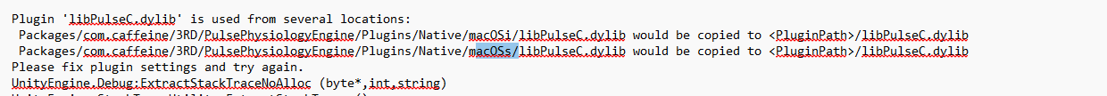 Packages/com.caffeine/3RD/PulsePhysiologyEngine/Plugins/Native/macOSs/libPulseC.dylib would be copied to /libPulseC.dylib”
